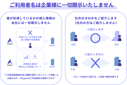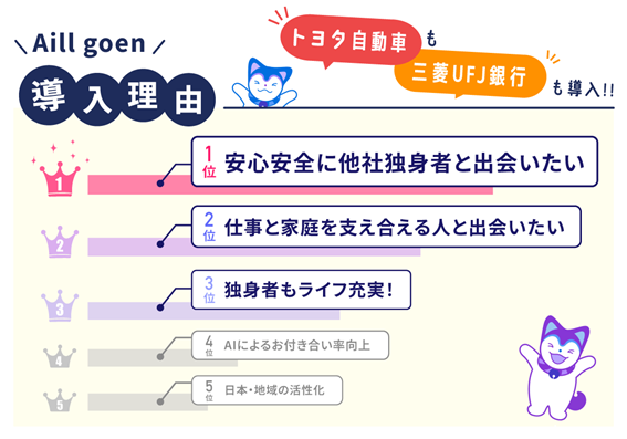 Aill goenは1,500社以上の企業が利用している企業専用の安心安全なAI縁結びアプリです
