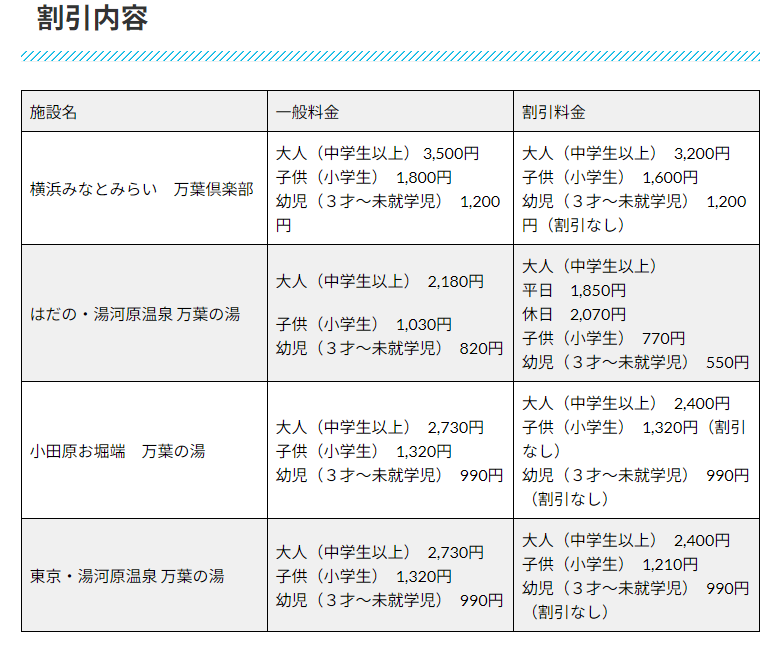 | 横浜みなとみらい 万葉倶楽部 はだの・湯河原温泉 万葉の湯 小田原お堀端 万葉の湯 東京・湯河原温泉 万葉の湯 | 横浜市中区新港2-7-1 秦野市河原町2-54 小田原市栄町1-5-14 東京都町田市鶴間7-3-1 | 会員証の提示により一般入館料よりお得な優待価格にて利用可能 |